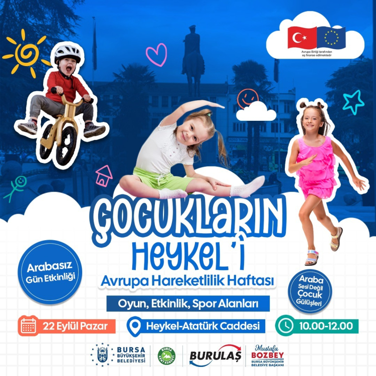 Bursa’da, Avrupa Hareketlilik Haftası etkinlikleri kapsamında sağlıklı yaşama vurgu yapmak amacıyla 22 Eylül Pazar günü Heykel Atatürk Caddesi trafiğe kapatılarak çocuklara bırakılacak. Bursa Büyükşehir Belediyesi tarafından hazırlanan birbirinden renkli etkinliklerle, çocuklar araba seslerinden uzak eğlenceli bir gün geçirecek.