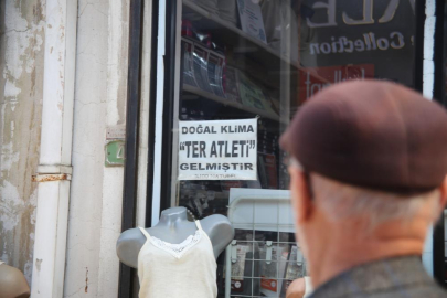 Meteoroloji Genel Müdürlüğü verilerine göre, yurt genelinde hava sıcaklıklarının hafta içinde yükseleceğini duyurması üzerine sıcaktan bunalmak istemeyen vatandaşlar çözüm yolu arıyor. Bursa'da yıllardır yün iç çamaşırı satışı yapan esnaf Naci Bağcı ise baharın gelmesini fırsat bilerek dükkanının camına bir afiş astı. Daha öncesinde 'Doğalgazı düşüren donlar burada' afişi ile görenleri şaşırtan Bağcı, bu sefer de 'Doğal klima ter atleti gelmiştir' yazarak görenleri gülümsetti.