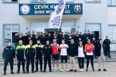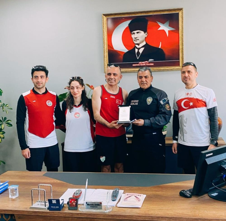 Çevik Kuvvet Şube Müdürlüğü'nde biten koşu sonrası sporcuları Şube Müdürü Mustafa Akıncı makamında ağırladı. Türk Emniyet Teşkilatı'nın 180. yıldönümü sebebiyle Bursalı Yasin Avcı, Gülbeyaz Özdemir, Metin Bozkurt ve Emin Sonlu, açtıkları 'Polis Haftanız kutlu olsun' pankartıyla Kent Meydanı'ndan koşmaya başladı. Kent Meydanı'ndan başlayan maraton, 6 kilometre devam ederek Çevik Kuvvet Şube Müdürlüğü'nde son buldu. Sporcuları kapıda karşılayan Çevik Kuvvet Şube Müdürü Mustafa Akıncı karşılayarak makamında ağırladı.