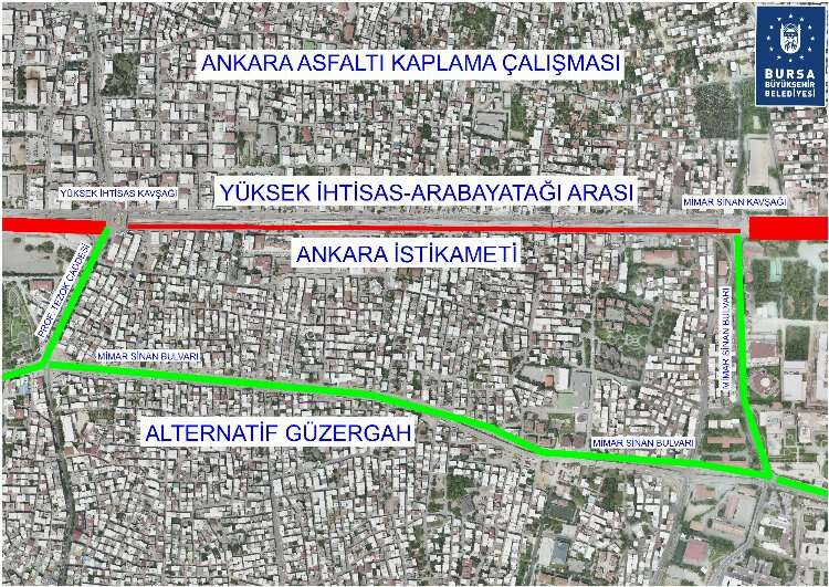 Bursa Büyükşehir Belediyesi tarafından asfalt yenileme çalışmaları tamamlanan Bursa – Ankara yolu Ankara gidiş istikameti Yüksek İhtisas Kavşağı ile Mimar Sinan Kavşağı arası, altyapı ızgara, baca imalatları, temizliği ve oto korkuluk bakımları yapılacağından 06 Eylül Çarşamba (BUGÜN) saat 23.59 ile 07 Eylül Perşembe (YARIN) günü saat 06.00 arasında trafiğe kapatılacak.