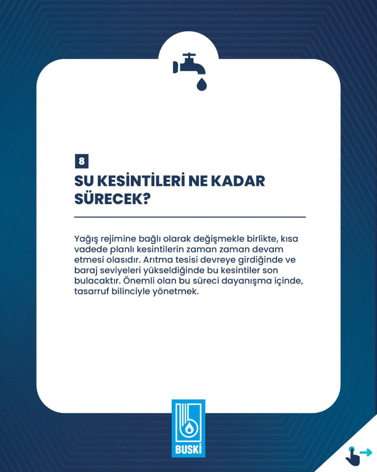 Kurumdan yapılan açıklamada, su kesintilerinin süresinin yağış rejimine bağlı olarak değişiklik gösterebileceği belirtildi. BUSKİ tarafından yapılan bilgilendirmede şu ifadeler yer aldı: “Kısa vadede planlı kesintilerin zaman zaman devam etmesi olasıdır. Arıtma tesisi devreye girdiğinde ve baraj seviyeleri yükseldiğinde bu kesintiler son bulacaktır. Önemli olan bu süreci dayanışma içinde, tasarruf bilinciyle yönetmek.”