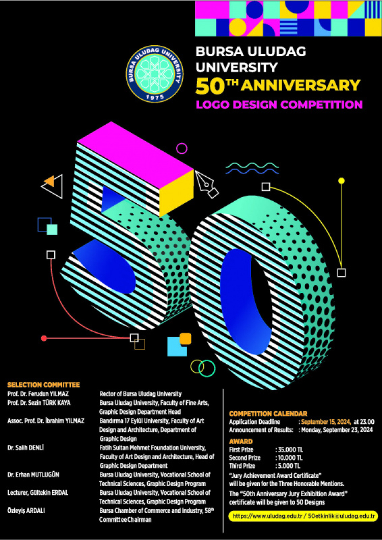 Türkiye’nin en köklü yükseköğretim kurumlarından birisi olan Bursa Uludağ Üniversitesi, eğitim-öğretimde yarım asrı geride bırakmaya hazırlanıyor. 2024-2025 eğitim-öğretim dönemiyle birlikte 50. kuruluş yıldönümü kutlamalarını da başlayacak olan Üniversite, bu özel yılda yapacağı tüm etkinlikleri yarışma sonunda seçilecek 50. yıl logosu ile tanıtacak.