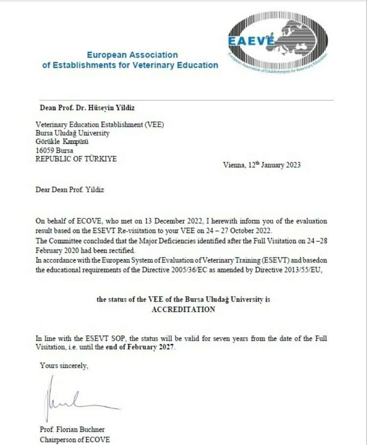 Bursa Uludağ Üniversitesi (BUÜ) Veteriner Fakültesi, ilk kez 2008 yılında Avrupa Veteriner Eğitimi Kurumları Birliği’nden (EAEVE) aldığı “Akredite Edilmiş Fakülte” unvanını yapılan denetimler neticesinde 2027 yılına kadar korumayı başardı.