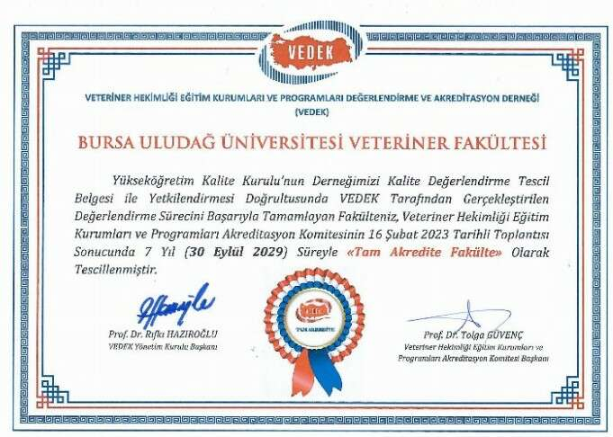 Ayrıca 2015 yılında Veteriner Hekimliği Eğitim Kurumları ve Akreditasyon Komitesi (VEDEK) tarafından 7 yıl süreyle akredite edilen BUÜ Veteriner Fakültesi, 20-25 Kasım 2022 tarihinde yapılan denetimler sonucunda 30 Eylül 2029 tarihine kadar 7 yıl süre ile yeniden “TAM AKREDİTE” unvanı almaya hak kazandı.