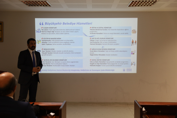 Araştırma, Geliştirme ve İnovasyon Şube Müdürü Salih Sadık Yaşar tarafından Büyükşehir Belediyesi’nin Ar-Ge alanındaki çalışmaları hakkında bilgi verildi. Bursa ve çevre kentlerdeki büyük şirketlerde kurumsal inovasyon ve girişimcilik faaliyetleri yürüten profesyonelleri buluşturduklarını anlatan Yaşar, Bursa Büyükşehir Belediyesi’nin kentin geleceğini inovasyonla şekillendirmeye çalıştığını belirterek bir araya gelen profesyonellerle yeni fikirlerin oluşmasını sağlamaya çalıştıklarını ifade etti.