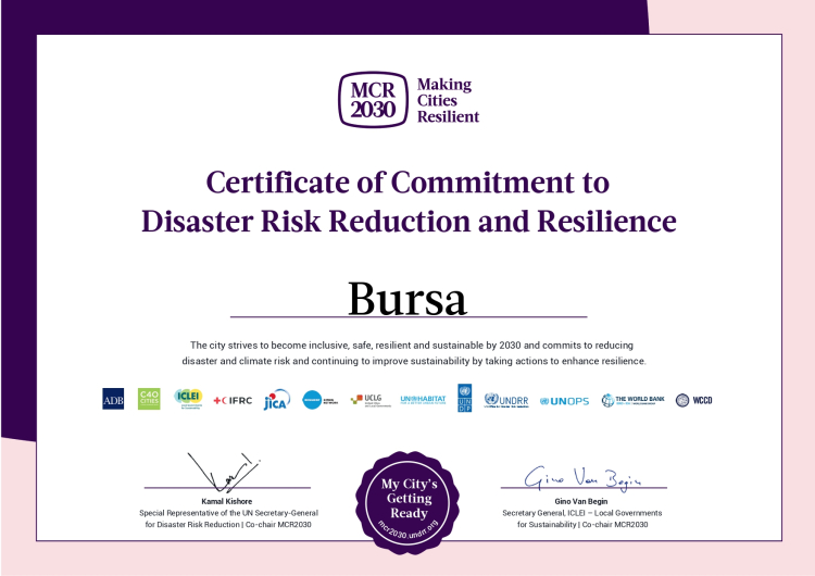 Bursa Büyükşehir Belediyesi, Birleşmiş Milletler (BM) bünyesindeki Afet Risk Azaltma Ofisi tarafından kentlerin afetlere karşı dirençli hâle getirilmesi, iş birliği yapılması ile karşılıklı bilgi ve tecrübelerin paylaşılması amacıyla başlatılan ‘Making Cities Resilience 2030’ (MCR2030) (Şehirleri Dirençli Hale Getirmek) programına üye oldu.