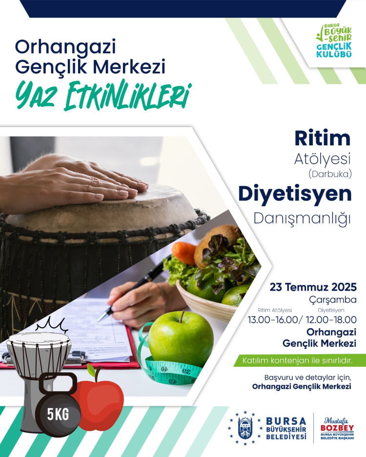 Orhangazi Gençlik Merkezi ev sahipliğinde yapılacak olan etkinliklerle, Bursalı gençler yaz tatilini hem eğlenerek hem de öğrenecek geçirecek. Temmuz ayı boyunca düzenlenecek olan bowling ve sınav gecesi etkinliği, sinema gösterimi, dart turnuvası, Cumalıkızık ve Gölyazı gezisi, interaktif oyunlar, karaoke gecesi, ritim atölyesi, diyetisyen danışmanlığı, münazara gecesi, yoga seansı, e-spor turnuvası, go-kart ve wake up partiyle gençliğin kalbi Bursa’da atacak. Detaylı bilgi ve başvuru için Orhangazi Gençlik Merkezi ziyaret edilebilir veya bbgenclikkulubu sosyal medya hesapları takip edilebilir.