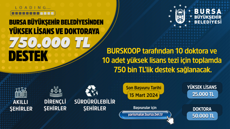 Bursa Büyükşehir Belediyesi tarafından ‘Akıllı şehirler, dirençli şehirler ve sürdürülebilir şehirler' temasıyla bilimsel çalışmalara destek olmak hedefiyle ‘Lisansüstü Tez Destek Programı' düzenlendi. Yüksek lisans ve doktora düzeyindeki çalışmaları desteklemek hedefiyle toplam 750 bin liralık kaynağın ayrıldığı programa, Bursa'da eğitim gören veya şehre katkı sağlayacak projeler üreten birçok öğrenci başvuruda bulundu. Destek programıyla, doğal kaynakları koruyan, sürdürülebilir ve yenilikçi çözümler geliştiren projeler üretilmesi, bilimsel çalışmalarla Bursa'nın geleceğine yön verilmesi hedeflendi. Tez çalışmalarını Bursa ölçeğinde gerçekleştiren yüksek lisans ve doktora öğrencileri, kentin sorunlarına yönelik bilimsel, yenilikçi ve uygulanabilir çözümler getirmek için çalışmalar yürüttü.
