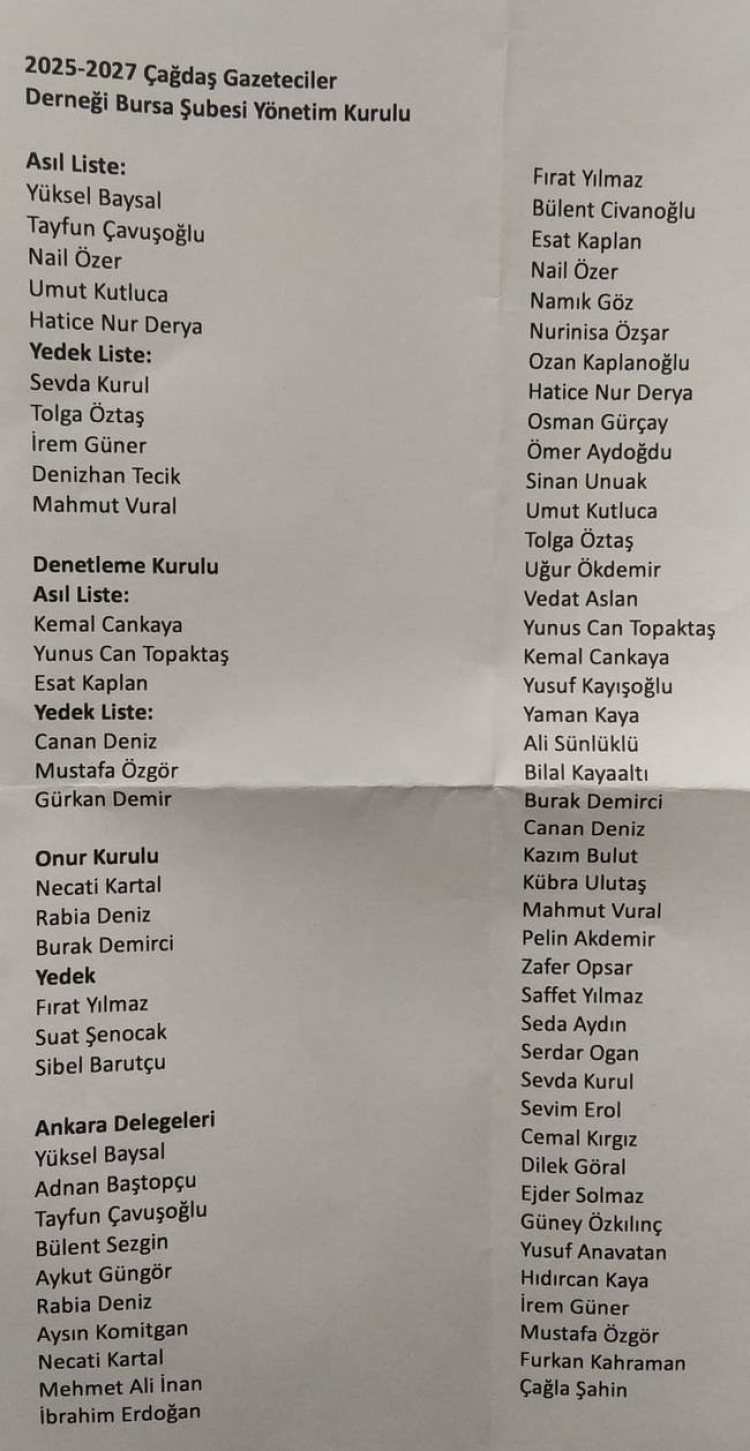 Çağdaş Gazeteciler Derneği (ÇGD) Bursa Şubesi’nin 19. Olağan Genel Kurul Toplantısı Bursa Akademik Odalar Birliği Türkan Saylan Salonu’nda gerçekleşti. Tek listeyle gidilen seçimde Yüksel Baysal yeniden başkan seçildi.