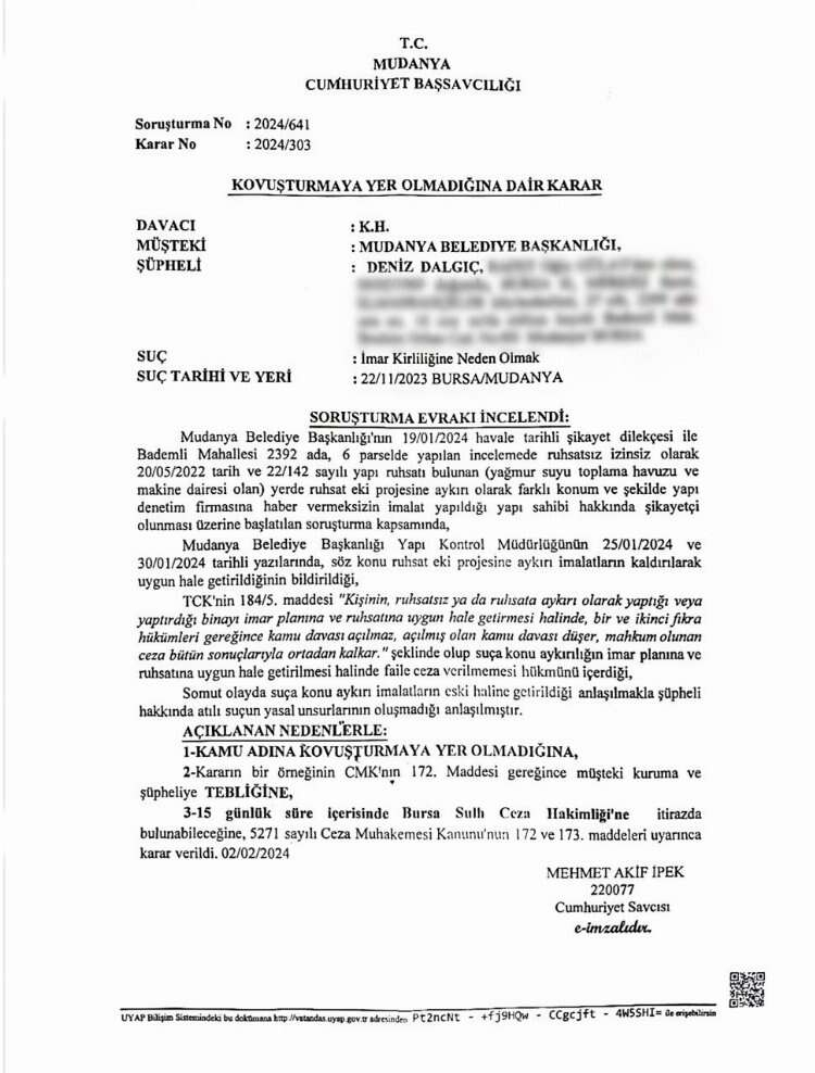 Bu durum; ekteki evrakta görüleceği üzere, Mudanya Cumhuriyet Başsavcılığımız tarafından “KOVUŞTURMAYA YER OLMADIĞINA” dair hükmüyle açıklığa kavuşmuştur.