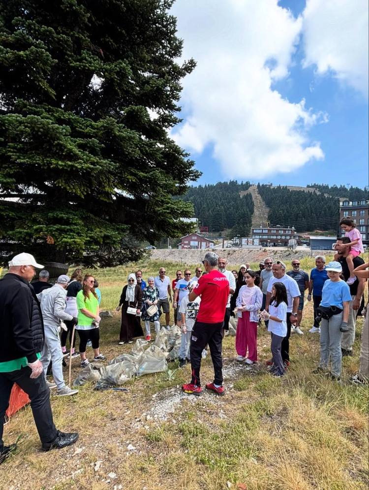 Uludağ'da yangın riskine karşı her taşın altını temizleyen kayak öğretmenleri ve aileleri, 30 poşet çöp ve 2 konteyner atık topladı.