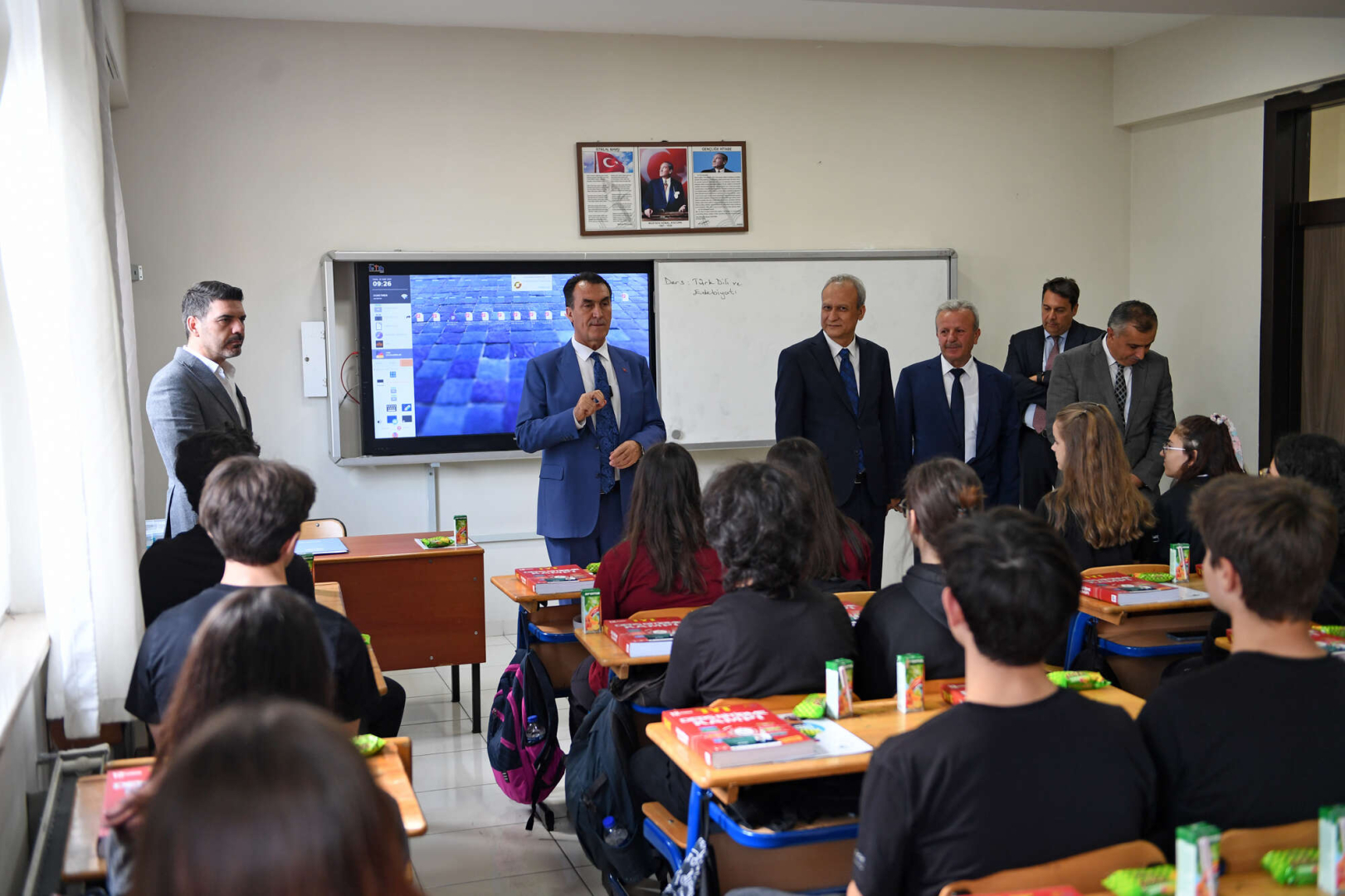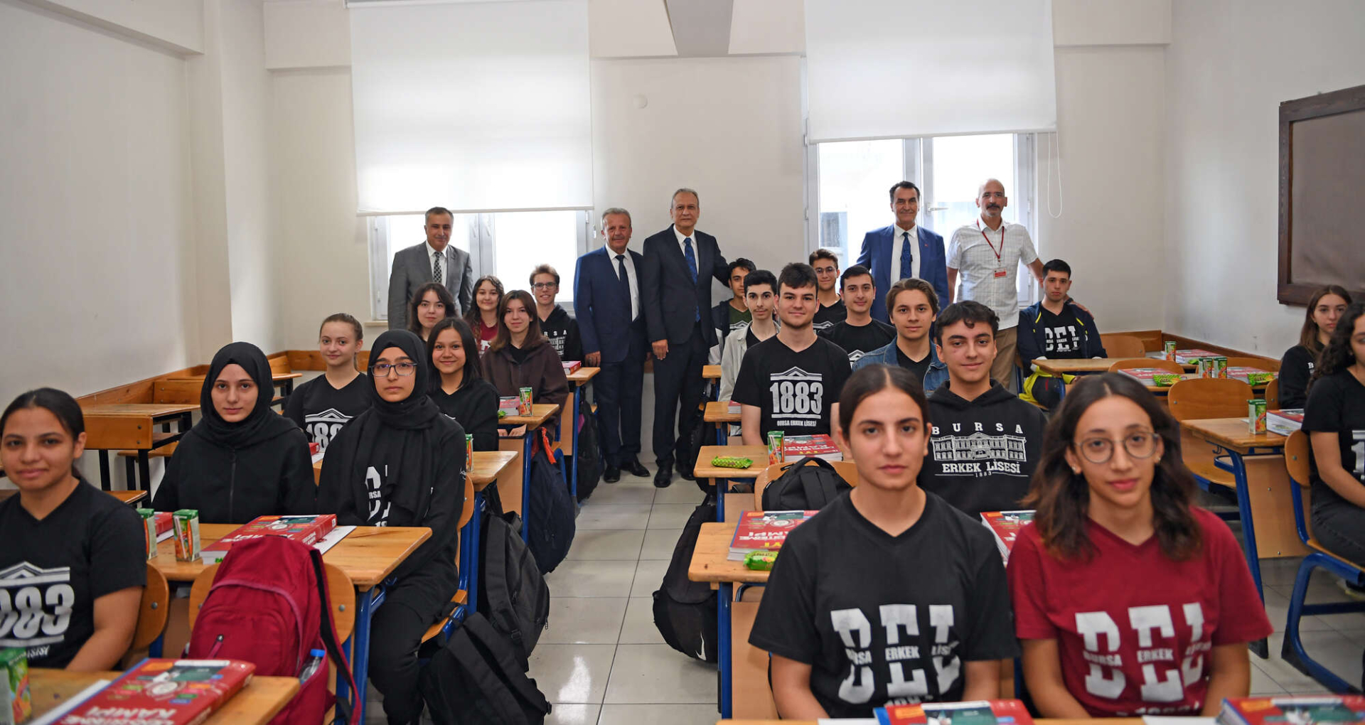 Osmangazi Belediye Başkanı Mustafa Dündar, Osmangazi Kaymakamı Ali Partal ile birlikte tarihi lisedeki sınıfları gezerek öğrencilere yardımcı kitap seti hediye etti.