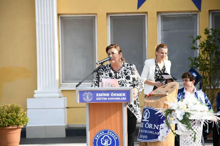 Emine Örnek Eğitim Kurumları Kurucu Müdürü Emine Örnek öğrencilere yönelik yaptığı konuşmasında; araştırmacı, demokratik, açık fikirli, vatanını seven bireyler olarak her yerde sevgiyi ve saygıyı yüceltmeleri gerektiğini hatırlattı.
