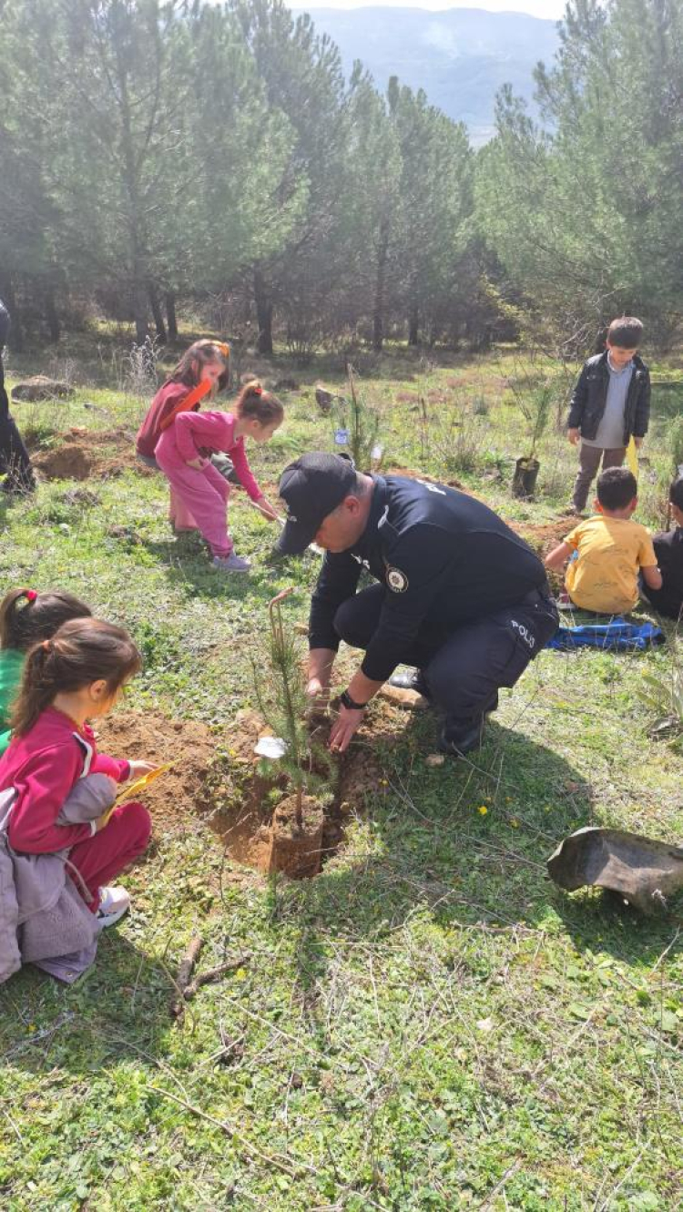 Bursa'da İznik Cumhuriyet İlkokulu ana sınıfı öğretmenleri ve öğrencileri emniyet personelleri ile birlikte 21-26 Mart Orman Haftası etkinlikleri kapsamında çok sayıda fidan diktiler.