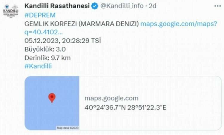 Kandilli Rasathanesi, Marmara Denizi Bursa Gemlik Körfezi'nde 3.0 büyüklüğünde deprem meydana geldiğini duyurdu.