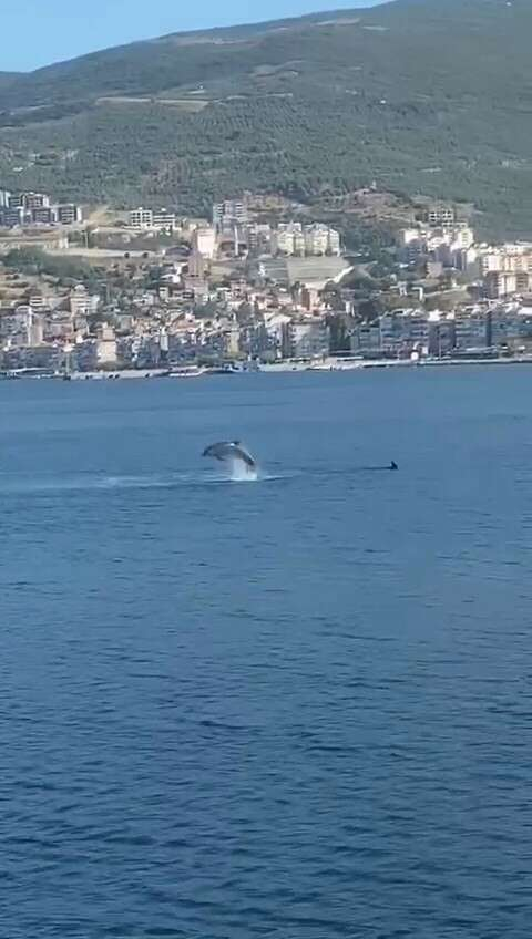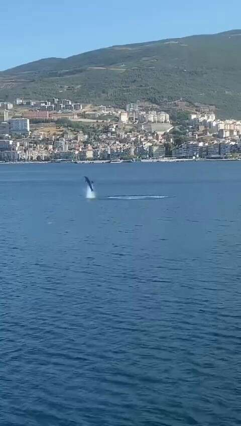 Gemlik Körfezi’nde zaman zaman ortaya çıkan yunuslar, sabah saatlerinde sahilden kendilerini izleyenlere resital sundu.