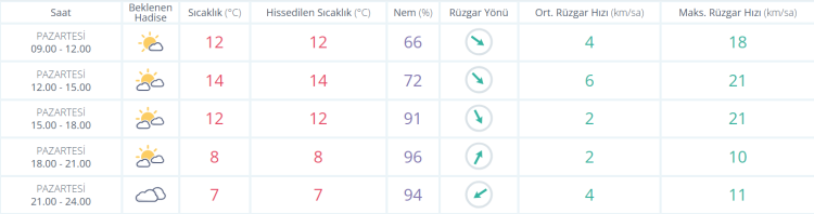 Parçalı ve çok bulutlu, akşam saatlerinden sonra bölge genelinin yağmurlu geçeceği tahmin ediliyor. Sabah saatlerinde bölge genelinde pus ve yer yer sis bekleniyor. Gece saatlerinden sonra rüzgarın kuzey yönlerden kuvvetli ve kısa süreli fırtına(40 - 70 km / saat) şeklinde eseceği tahmin ediliyor.