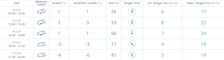 Meteoroloji Genel Müdürlüğü tarafından yapılan tahminlere göre: Yurdun kuzey, iç ve doğu kesimlerinin parçalı ve çok bulutlu, Marmara’nın doğusu, İç Anadolu'nun kuzeyi, Karadeniz, Doğu Anadolu’nun kuzey ve doğusu, Kırklareli kıyıları ile Aksaray, Nevşehir, Kayseri ve Siirt çevrelerinin kar yağışlı, diğer yerlerin az bulutlu geçeceği tahmin ediliyor. Yağışların; Orta ve Doğu Karadeniz kıyıları, Sinop çevreleri ile Kastamonu'nun kıyı kesimlerinde yer yer kuvvetli olması bekleniyor. Kuzey, iç ve doğu kesimlerde kuvvetli olmak üzere yurt genelinde buzlanma ve don olayı görüleceği tahmin ediliyor. Doğu Karadeniz’in iç kesimlerinin yüksekleri ile Doğu Anadolu’nun yüksek ve dik yamaçlarında çığ tehlikesi bulunmaktadır.
