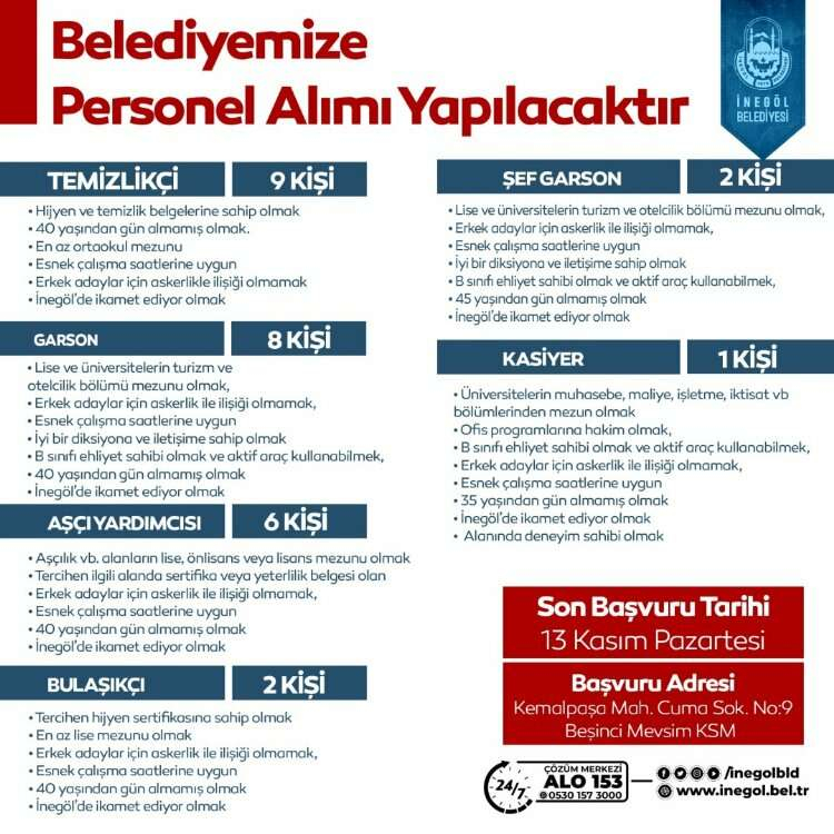 İnegöl Belediyesi, 6 ayrı alanda çalışmak üzere 28 personel alımı yapılacağını duyurdu. Son başvuru 13 Kasım 2023 Pazartesi olarak açıklanan personel alımı kapsamında; 9 temizlikçi, 8 garson, 6 aşçı yardımcısı, 2 bulaşıkçı, 2 şef garson ve 1 kasiyer alınacak.
