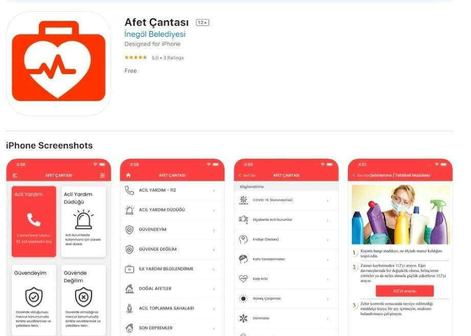 İnegöl Belediyesi tarafından akıllı telefonlar için hazırlanan Afet Çantası programı afet anında "güvendeyim ya da güvende değilim" mesajı göndermenin yanısıra, GSM sistemi olmadan 112’yi arama ve acil yardım düdüğü çalma özelliği ile hayat kurtarıyor.