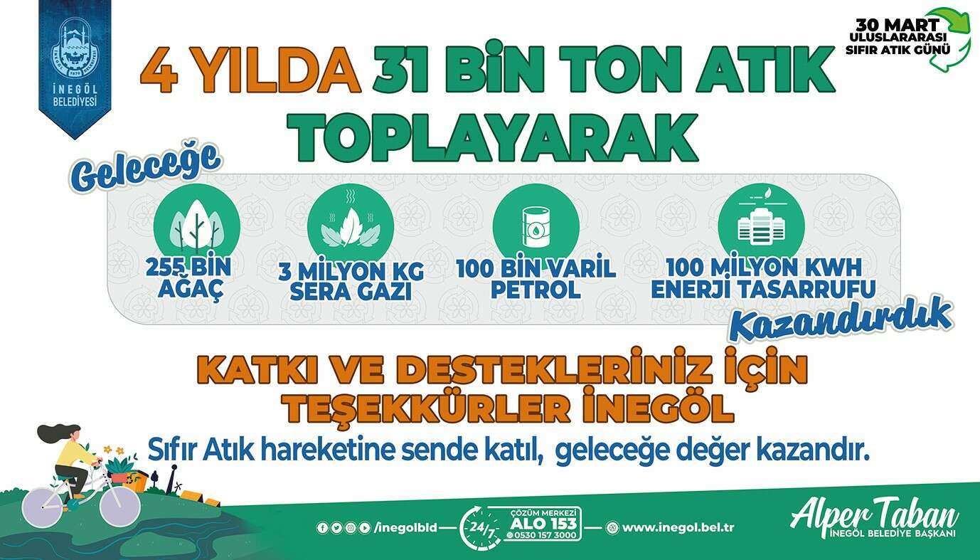 İnegöl Belediyesi, 30 Mart Uluslararası Sıfır Atık Günü nedeniyle hem sıfır atık ve geri dönüşüme dikkat çekmek hem de bu alanda yapılan çalışmaları kamuoyuna duyurmak adına bir bilboard çalışması gerçekleştirdi. 4 yılda elde edilen kazanımların tek tek sıralandığı tasarımda, ilçe halkına da verdikleri destekten dolayı teşekkür edildi. Yapılan çalışmada 4 yılda 31 bin ton atık toplandığı ve bu atıklarla; 255 bin ağaç, 2 milyon kg sera gazı, 100 bin varil petrol ve 100 milyon kwh enerji tasarrufu sağlandığı açıkladı.