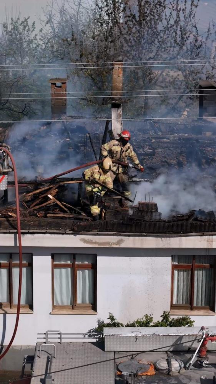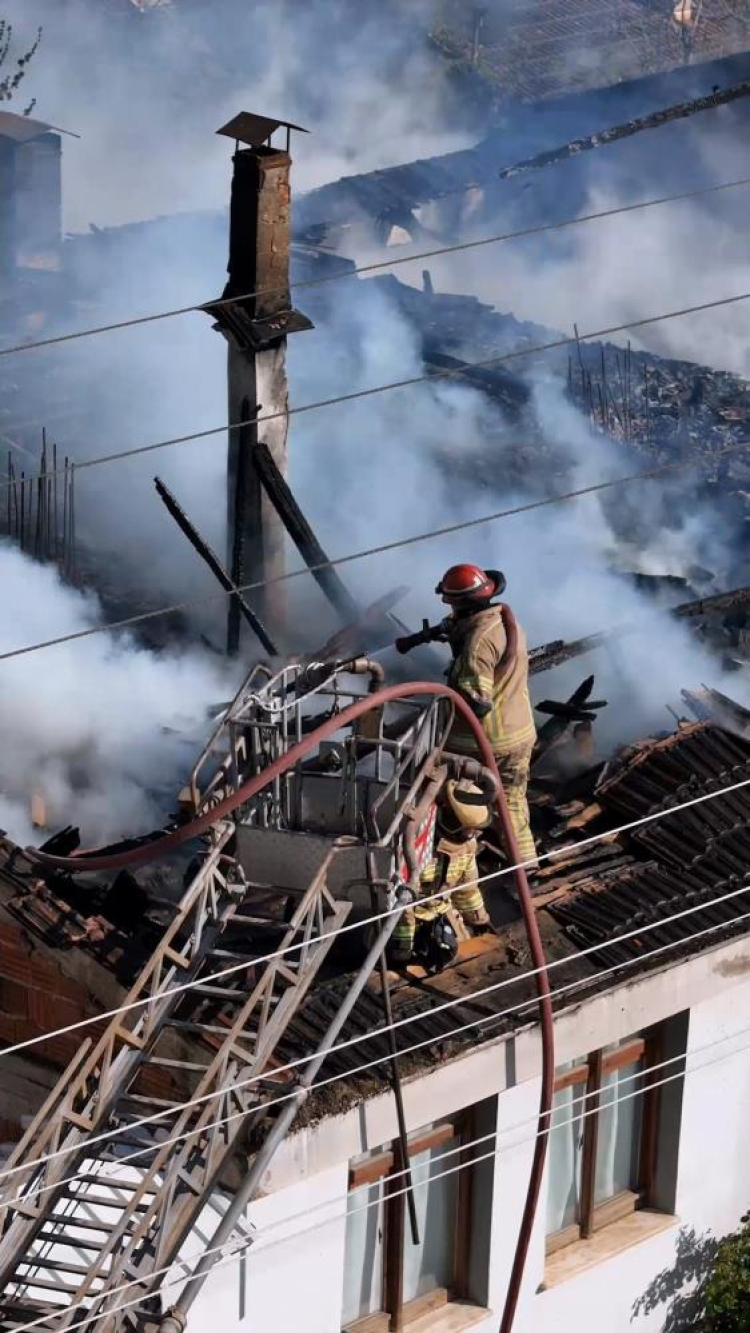 Bursa'nın İnegöl ilçesinde tek katlı ev alev alev yandı. Yangın ve söndürme anları havadan görüntülendi.