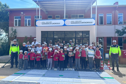 Bursa'nın Karacabey ilçesindeki Karakoca İlköğretim Okulu'nda, Trafik Haftası kapsamında çocuklara güvenli trafik eğitimi verildi.