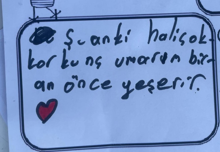 Bazı çocuklar ise boyama kağıtları üzerine, "Şu anki hali çok korkunç. Umarım bir an önce yeşerir.", "Ormanın değerini bilemediğimiz için yanıp gül oldu", "Hemen ağaçlandırılmalı, yeşillendirilmeli" gibi yazılarla duygularını dile getirdi.