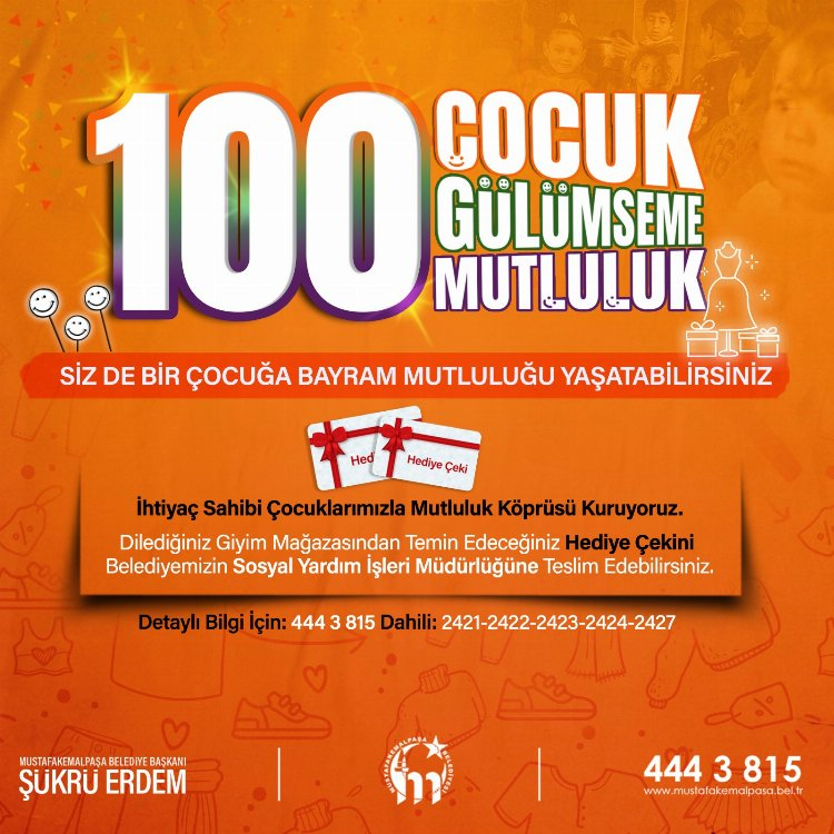 Mustafakemalpaşa Belediyesi Sosyal Yardım İşleri Müdürlüğünce 100 Çocuk 100 Gülümseme 100 Mutluluk kampanyası, Başkan Erdem öncülüğünde hayat geçirildi. Başkan Erdem ilk bağışı yaparak ‘’ Çocukların mutluluğu bizlere umut oluyor. Böylesine özel bir kampanyaya öncülük etmenin gururunu yaşıyorum.’’ İfadelerini kullandı.
