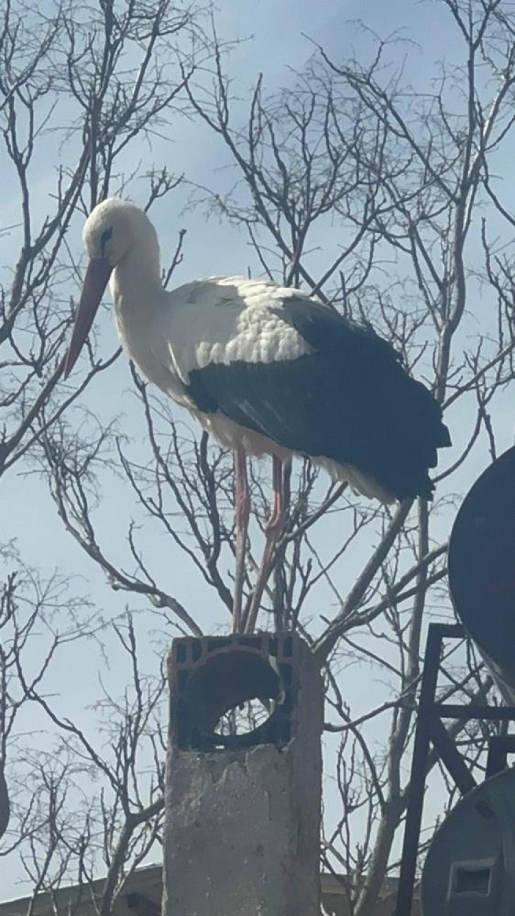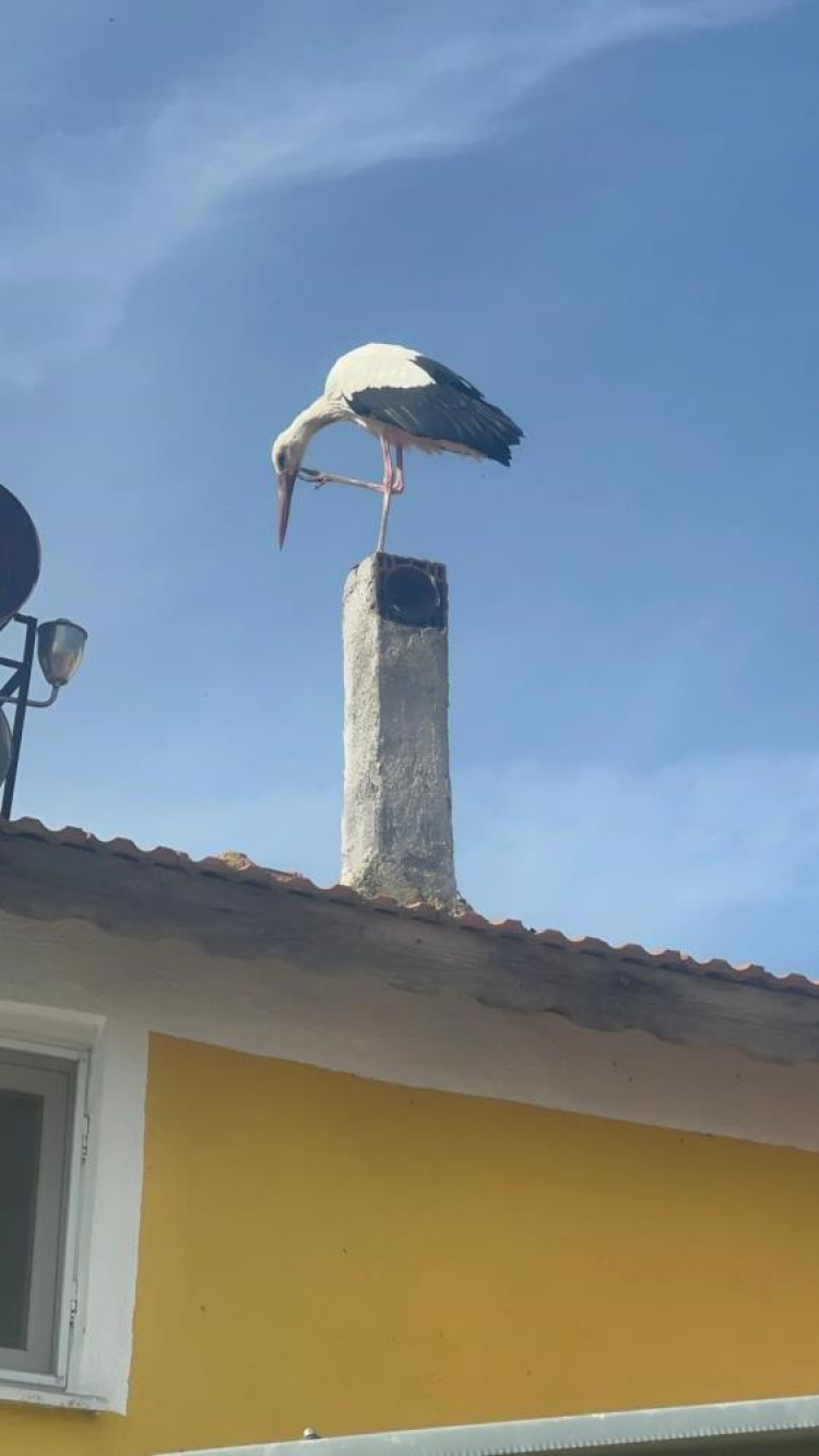 Adem Yılmaz'ın evinin bacasına ve çatısına konan leylek, Eskikaraağaç Mahallesi sakinlerini de heyecalandırdı.