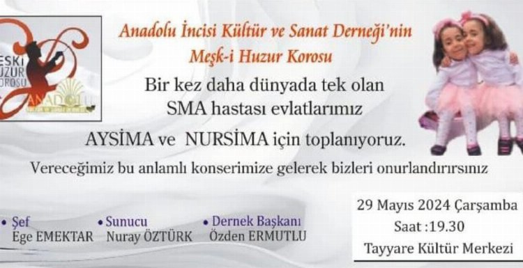 Anadolu İncisi Kültür ve Sanat Derneği’nin Meşk-i Huzur Korosu SMA hastası Aysima ve Nursima kardeşler için sahne alacak.