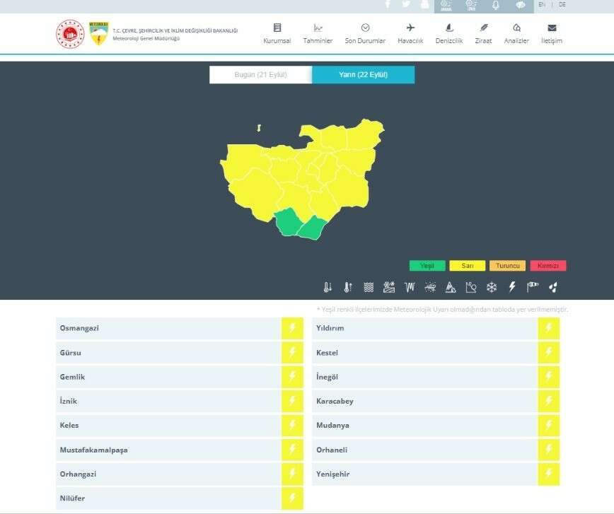 Meteoroloji Genel Müdürlüğü, Bursa için sarı kodlu uyarıda bulundu. Bu gece saat 03.00'dan başlayıp cuma günü 06.00'a kadar sürmesi beklenen yağışla ilişkin yapılan açıklamada "Kuvvetli (30-60 kg/m2) sağanak ve gök gürültülü sağanak yağış beklendiğinden sel, su baskını, yıldırım, heyelan, yerel dolu yağışı ve yağış anında kuvvetli rüzgar gibi olumsuzluklara karşı dikkatli olunması gerekmektedir." denildi.