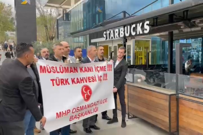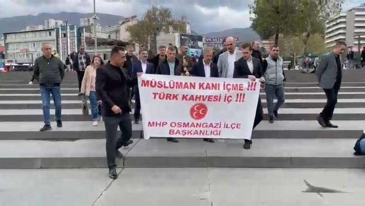 Dünya genelinde faaliyet gösteren ünlü kahveci Starbucks'ın İsrail'e desteğini açıklamasının ardından, birçok şubesinde boykotların ardı arkası kesilmiyor. Bursa'da toplanan MHP Osmangazi İlçe Başkanlığı üyeleri, ellerindeki Türk kahveleriyle gençlerin yayına gitti. Açtıkları pankartla, 'Müslüman kanı içme. Türk kahvesi iç' mesajı verdi.
