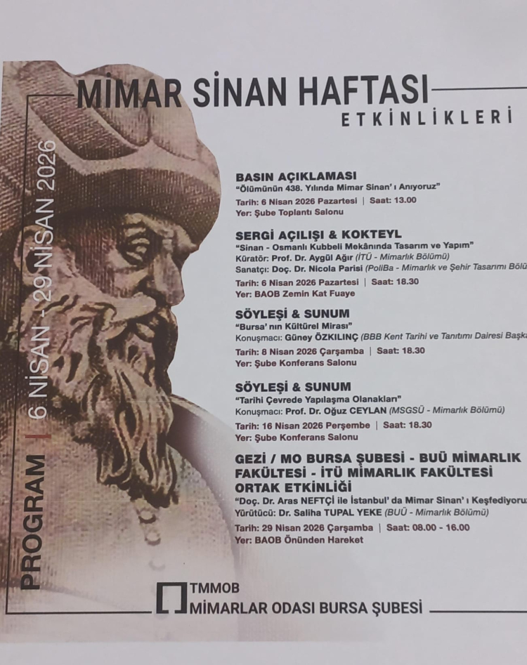 Öte yandan Mimar Sinan’ı anma kapsamında bir dizi etkinlik de duyuruldu. Sergiler, söyleşiler ve teknik gezilerle ustanın mimarlık anlayışının farklı yönleri ele alınacak. Yetkililer, “Tüm meslektaşlarımızı ve ilgilileri etkinliklerimize davet ediyoruz” diyerek çağrıda bulundu.