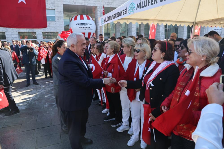 Saygı duruşu ve İstiklal Marşı'nın okunmasının ardından konuşan Nilüfer Belediye Başkanı Şadi Özdemir, "Bugün, bir milletin küllerinden yeniden doğduğu, özgürlüğü, eşitliği ve adaleti temel alan yeni bir yaşamı kurduğu büyük günün yıl dönümündeyiz" dedi.