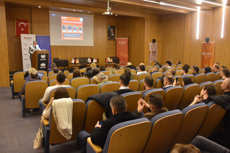 ASSET GLI İş Geliştirme Müdürü Hüseyin Dinsever de Avrupa Birliği’nin yürürlüğe koyduğu Yeşil Mutabakat ve Sınırda Karbon Düzenleme Mekanizması ve firmaların yerine getirmesi gereken koşullar hakkında bilgiler verirken, ASSET GLI Risk ve Yasal Uyum Koordinatörü Barış Çakır sunumunda ‘Tedarik zincirinde maliyet azaltıcı gümrük uygulamaları’ konusuna değindi.