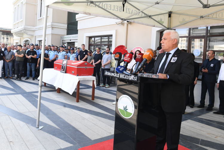 Belediye binası önünde düzenlenen törende konuşan Bursa Büyükşehir Belediye Başkanı Mustafa Bozbey, “Feyyaz Alptuğ Memişoğulları kardeşimize Allah’tan rahmet, ailesine ve sevenlerine baş sağlığı diliyorum. Gencecik yaşında, hayalleri olan ve gelecekte kentimiz adına önemli görevlerde bulunabilecek potansiyele sahip olan bu güzel kardeşimizi kaybetmenin üzüntüsü içerisindeyim. Allah mekanını cennet eylesin. Rabbim geride kalanlara sabır versin. Allah bu acıyı kimseye yaşatmasın. Hepimizin başı sağ olsun” dedi.