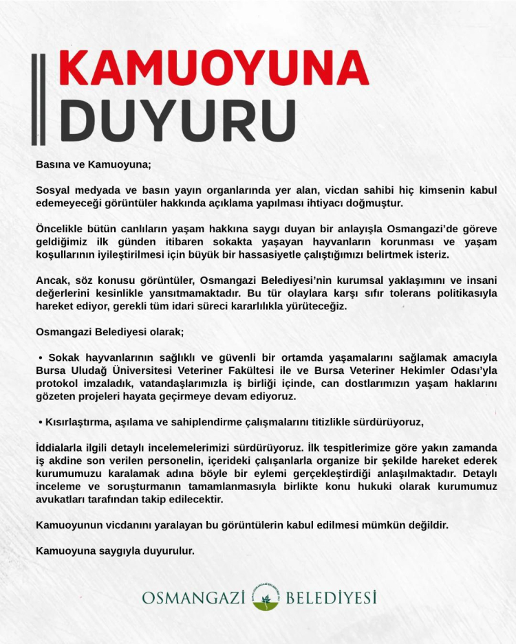 Osmangazi Belediyesi, sosyal medya ve basın yayın organlarında yer alan, vicdan sahibi kimsenin kabul edemeyeceği görüntüler hakkında açıklamada bulundu.