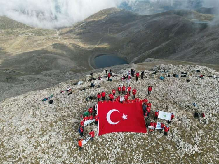 Türkiye Cumhuriyeti’nin 100’üncü yılını farklı alanda kutlamak için harekete geçen 49 doğasever, Uludağ oteller bölgesinde bir araya gelerek zirveye tırmanışı gerçekleştirdi. Oteller bölgesinden yürüyüşe geçen dağcılar, ilk önce 2 bin 486 metre rakımda bulunan küçük zirveye tırmandı. Buradan hareket ederek toplamda 4 saatlik yolculuğun ardından 2 bin 543 rakımlı büyük zirveye ulaştı. Dağcılar ulaştıkları büyük zirvede Türk Bayrağı açıp, İstiklal Marşı’nı okuyarak Cumhuriyetin 100’üncü yılını kutladı.
