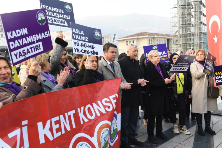 Kadına yönelik şiddetle mücadele konusunda toplumsal farkındalık oluşturmanın hedeflendiği basın açıklamasında, ‘eşit, özgür, şiddetsiz bir yaşamı birlikte kuracağız’ mesajı verildi. Osmangazi Meydanı’nda düzenlenen basın açıklamasına Osmangazi Belediye Başkanı Erkan Aydın, Osmangazi Kent Konseyi Başkanı Fatma Çil Yılmaz, Osmangazi Kent Konseyi Kadın Meclisi Başkanı Sevgi Baysal, belediyedeki kadın personeller ile kadına yönelik şiddete dur diyen onlarca kadın katıldı.