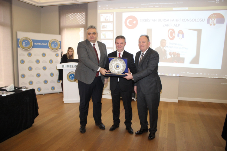 Sunumlarından sonra RUMELİSİAD Yönetim Kurulu Başkanı Murat Evke ile Rumeli Vakfı Mütevelli Heyet Başkanı Taner Bolcan tarafından konuk fahri konsoloslara teşekkür plaketi takdim edildi.
