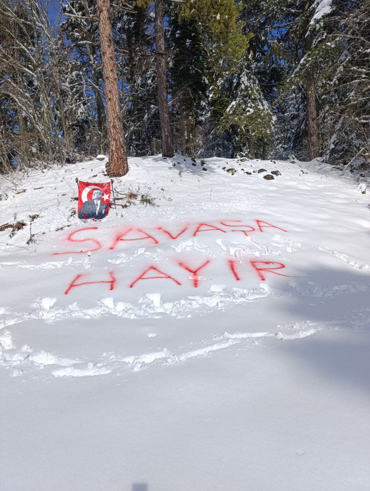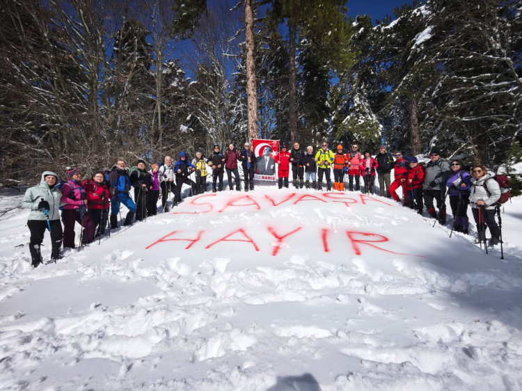 Etkinlik sırasında kulüp üyeleri ve katılımcılar, dünyada yaşanan savaş ve çatışmalara dikkat çekmek amacıyla anlamlı bir mesaj verdi. Beyaz kar örtüsü üzerine büyük harflerle “SAVAŞA HAYIR” yazan doğaseverler, hep birlikte “SAVAŞA HAYIR, YURTTA SULH CİHANDA SULH” sloganları attı. Doğanın saflığını temsil eden kar zemini üzerinde yükselen bu mesaj, sporun barışçıl ve birleştirici gücünü bir kez daha ortaya koydu.