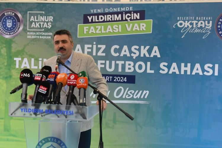 Bin 733 metrekaresinin yeşil alan, yürüyüş yolu ve spor alanları bulunan 5 bin metrekarelik Nafiz Caşka Futbol Sahası, törenle hizmete açıldı. Yıldırım’da spor yatırımlarına yeni halkalar eklemeye devam ettiklerini belirten Yıldırım Belediye Başkanı Oktay Yılmaz, “Yıldırım’ı bir spor kenti yapmak ve sporu tabana yaymak için çalışmalarımız sürüyor. İlçemizin dört bir yanını tesislerle donatarak hemşehrilerimize yürüyüş mesafesinde spor yapma imkânı sunuyoruz. Göreve geldiğimiz 2019 yılından bu yana bakanlığımızın ve büyükşehir belediyemizin destekleri ile başta Bursa’nın en büyük spor kompleksi Naim Süleymanoğlu Spor Kompleksi olmak üzere 23 spor yatırımı hayata geçirdik. Hemşehrilerimizin kolaylıkla erişebileceği 8 semt sahasını ilçemize kazandırdık. Hamdolsun, spora yaptığımız yatırımlar meyvelerini veriyor. Lisanslı sporcu sayımız 4 bin 454 olurken, sporcularımız 3 bin 421 madalya ve 197 kupa kazandı. 11 tesiste düzenlediğimiz yaz ve kış spor okullarında 20 farklı branşta 166 bin 300 çocuğa, sosyal sorumluluk projelerinde 32 bin 122 çocuğa, özel ihtiyaç sahibi bin 456 çocuk ve ailesine, kadın spor merkezlerimizde 54 bin 322 kadına, 5 yılda 254 bin 200 vatandaşa spor ve eğitim hizmeti verdik” dedi.