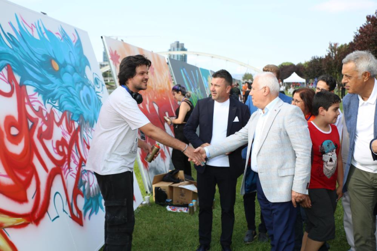 Bursa Büyükşehir Belediye Başkanı Mustafa Bozbey; Genel Sekreter Yardımcısı Mehmet Yıldız, Park ve Bahçeler Dairesi Başkanı Hakan Tanrıöver, BURFAŞ Yönetim Kurulu Başkanı Yalçın Işıkyıldız, Kültür AŞ Genel Müdürü Yankı İçöz ile birlikte alanı gezerek sanatçılarla ve vatandaşlarla sohbet etti. Kendisi de sprey boyayla panolara iz bırakan Başkan Mustafa Bozbey, profesyonel sanatçıların çalışmalarını yakından izledi. İki gün süren Graffiti Şenliği'ne Bursalıları davet eden Başkan Bozbey, “Bu yıl 3.'sü yapılan şenliğe 18'i Bursa'dan, 44'ü farklı şehirden ve 2'si yabancı ülkelerden olmak üzere toplam 64 sanatçı şenlikte yer alıyor. Vatandaşlarımızın ortaya çıkan güzel eserleri görmesini isterim. Şenliğin ardından panolara yansıyan eserler Bursa'nın farklı noktalarında ve mekanlarında halkımızla buluşacak. Emeği geçenlere teşekkür ediyorum” dedi.