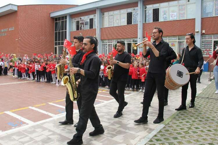 Bando Takımı, Öğretmen Mehmet Aras İlkokulu'nda düzenlenen etkinlikte sevilen marşları coşkuyla seslendirirken, öğrenciler 23 Nisan ruhunu Türk bayraklarıyla donanmış bir şekilde doyasıya yaşadılar. Okulun değerli öğretmenleri, öğrencilerle birlikte dans ederek ve şarkılar söyleyerek bu mutluluğa ortak oldular. Çocuklar, bir arada eğlenmenin keyfini çıkarırken, bu özel günü dolu dolu anılarla hatırlayacakları bir deneyim yaşadılar.