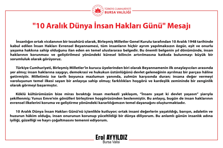 Bursa Valisi Erol Ayyıldız, 10 Aralık Dünya İnsan Hakları Günü dolayısıyla bir mesaj yayımladı.