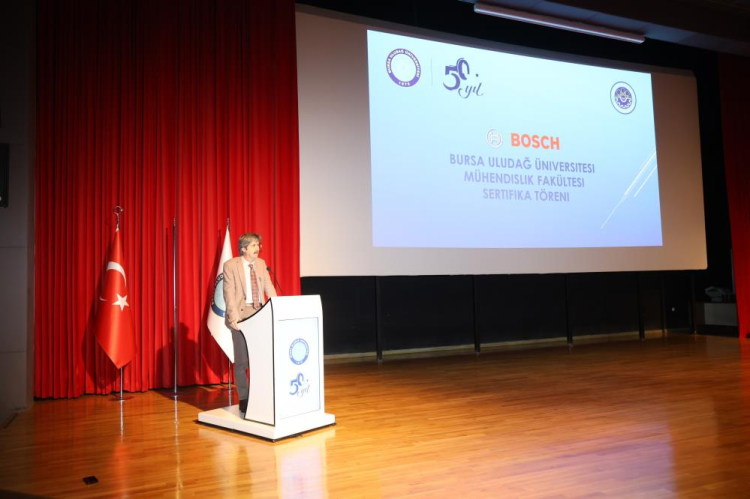 Açılışta konuşan Rektör Prof. Dr. Ferudun Yılmaz, “Bu sertifikasyon programı, Bosh gibi dünya devi bir marka ile 50. yaşını kutlayan ve bir araştırma üniversitesi olan BUÜ’nün işbirliği açısından son derece kıymetlidir. Öğrencilerimizin, yetkinliklerini arttırarak doğrudan sanayi ile olan irtibatını henüz öğrenciyken gerçekleştirme imkanı bulmaları çok önemli. Özellikle Bursalı firmalarda istihdam edilen mezun mühendislerimizin oranı yüzde 30’lara kadar çıkıyor. Bu yüzden sertifika programının şekillenmesinde katkısı olan, başta direktörümüz ve dekanımız olmak üzere eğitmenlerimize, hocalarımıza çok teşekkür ediyorum. Doğrudan ve daha organik bir ilişki ile piyasayla temas kurma imkânını yakaladıkları ve ısrarlı bir biçimde bunu takip ettikleri için de kıymetli öğrencilerimizi tebrik ediyorum” ifadelerinde bulundu.