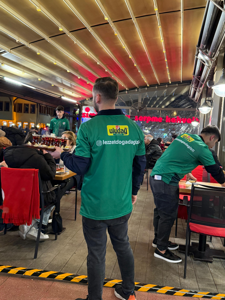 Pek çok iş yeri Bursaspor bayrağıyla süslenirken, Bursa'da Setbaşı'nda hizmet veren bir işletmede garsonlar yeşil beyaz forma giyerek, müşterilere hizmet verdi. Müşterilerden olumlu tepkiler alan garsonlar, şampiyon Bursaspor'u kutladı.