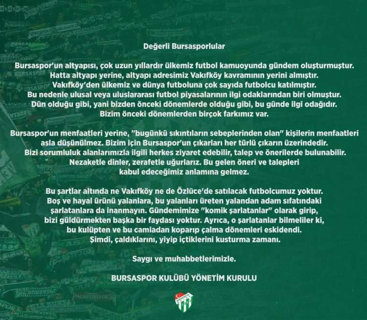 Bursaspor Kulübü, ‘Geleceğimizi Satamazsınız’ başlıklı yaptığı açıklamada şu ifadelere yer verdi: “Bursaspor'un altyapısı, çok uzun yıllardır ülkemiz futbol kamuoyunda gündem oluşturmuştur. Hatta altyapı yerine, altyapı adresimiz Vakıfköy kavramının yerini almıştır. Vakıfköy'den ülkemiz ve dünya futboluna çok sayıda futbolcu katılmıştır. Bu nedenle ulusal veya uluslararası futbol piyasalarının ilgi odaklarından biri olmuştur. Dün olduğu gibi, yani bizden önceki dönemlerde olduğu gibi, bu günde ilgi odağıdır. Bizim önceki dönemlerden birçok farkımız var. Değerli Bursasporlular, Bursaspor'un menfaatleri yerine, ‘bugünkü sıkıntıların sebeplerinden olan’ kişilerin menfaatleri asla düşünülmez. Bizim için Bursaspor'un çıkarları her türlü çıkarın üzerindedir. Bizi sorumluluk alanlarımızla ilgili herkes ziyaret edebilir, talep ve önerilerde bulunabilir. Nezaketle dinler, zarafetle uğurlarız. Bu gelen öneri ve talepleri kabul edeceğimiz anlamına gelmez. Bu şartlar altında ne Vakıfköy ne de Özlüce'de satılacak futbolcumuz yoktur. Boş ve hayal ürünü yalanlara, bu yalanları üreten yalandan adam sıfatındaki şarlatanlara da inanmayın. Gündemimize 'komik şarlatanlar’ olarak girip, bizi güldürmekten başka bir faydası yoktur. Ayrıca, o şarlatanlar bilmeliler ki, bu kulüpten ve bu camiadan koparıp çalma dönemleri eskidendi. Şimdi, çaldıklarını, yiyip içtiklerini kusturma zamanı. Saygı ve muhabbetlerimizle. Bursaspor Kulübü Yönetim Kurulu.”