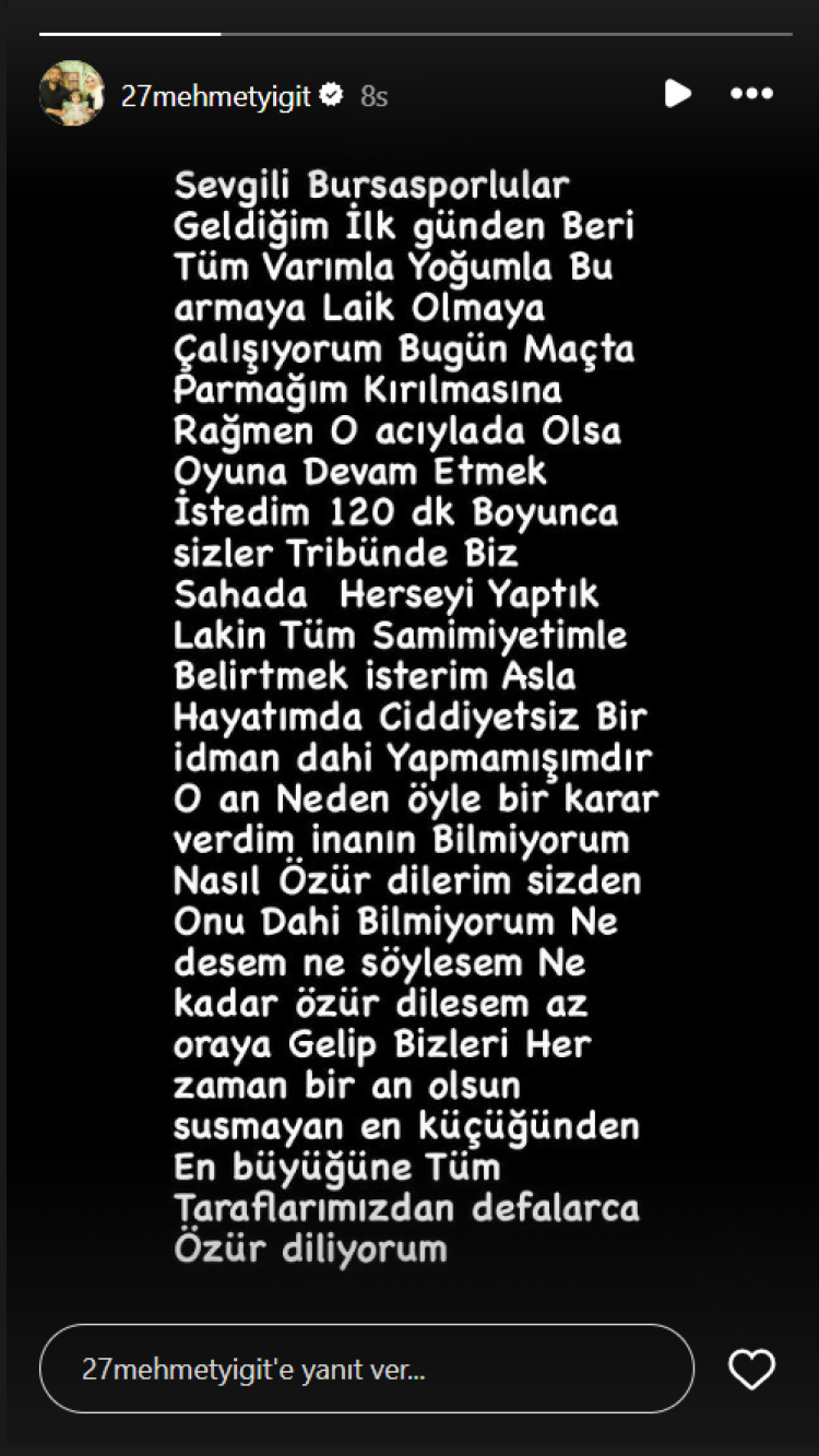 "Sevgili Bursasporlular geldiğim ilk günden beri tüm varımla yoğumla bu armaya laik olmaya çalışıyorum. Bugün maçta parmağım kırılmasına rağmen o acıylada olsa oyuna devam etmek istedim. 120 dk. boyunca sizler tribünde biz sahada her seyi yaptık lakin tüm samimiyetimle belirtmek isterim asla hayatımda ciddiyetsiz bir idman dahi yapmamışımdır. O an neden öyle bir karar verdim inanın bilmiyorum. Nasıl özür dilerim sizden onu dahi bilmiyorum. Ne desem ne söylesem ne kadar özür dilesem az. Oraya gelip bizleri her zaman bir an olsun susmayan en küçüğünden en büyüğüne tüm taraflarımızdan defalarca özür diliyorum."